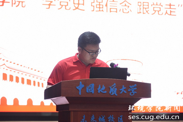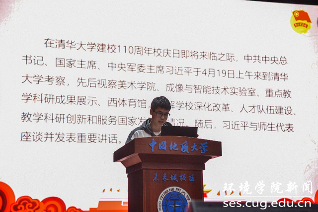 研究生会组织部部长王宇作“学习习近平总书记清华之行讲话精神”的分享。他通过节选习近平总书记在清华考察期间不同场合的讲话,在自己的理解上逐一向大家分享感悟。他谈到:“环境学子应不断锤炼品德,自觉树立和践行社会主义核心价值观,脚踏实地、埋头苦干,敢为人先、敢于突破,争做红专能优的生态环保铁军。”
